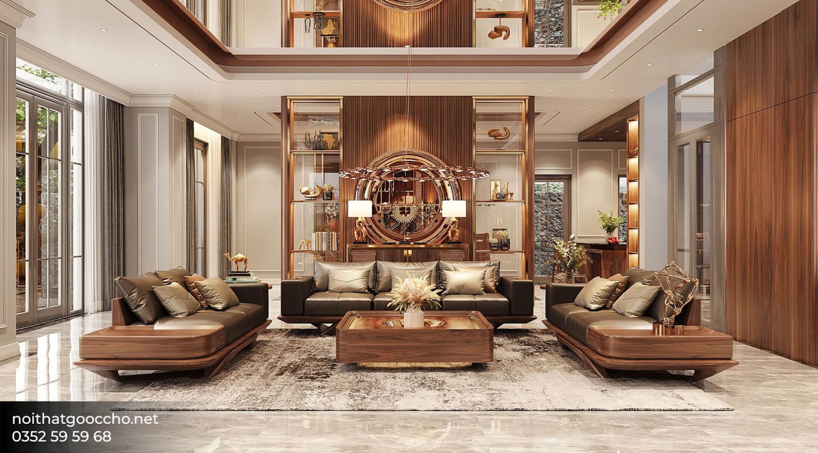 Đẳng cấp sang trọng với bộ sofa gỗ óc chó 4 món trong biệt thự cao cấp