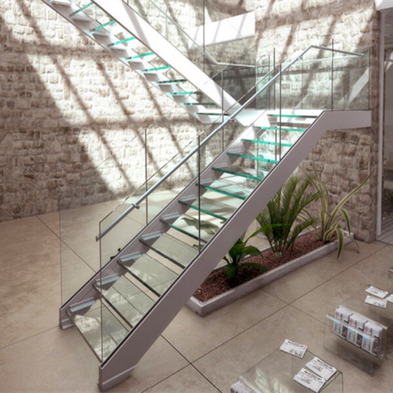 Mặt bậc cầu thang được sản xuất từ bê tông hoặc gỗ trong khi phần lan can làm từ chất liệu kính. Loại cầu thang này phù hợp với phong cách nội thất đơn giản, hiện đại. Kính cường lực không bị cong vênh, sâu mọt như gỗ. Quá trình tháo lắp và sửa chữa cũng rất nhanh và gọn.